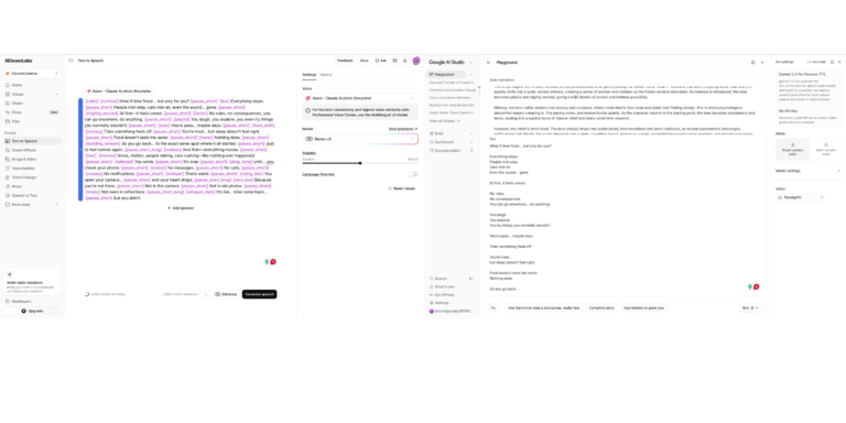 [The UI Friction. ElevenLabs (Left) uses a tag-based emotional system like [whisper] and [rising_fear]. Google AI Studio (Right) requires a cleaner, more instructional approach. Mastering both is what dropped my production time from 5 hours to 45 minutes.]