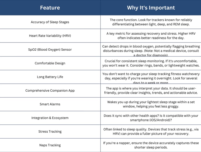 Major features that should be considered when buying a sleep tracking fitness watch.